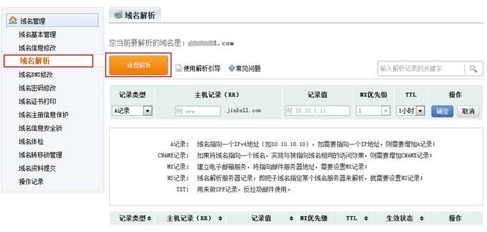 3.在解析中,解析类型选择【CNAME记录】>>主机记录填写子域名名称>>记录值填写弈盾分配CNAME别名。(注:不同的子域名弈盾分配的CNAME别名是不同的)【同一个子域名若已经存在A记录,请删除A记录以免发生冲突,A记录与CNAME记录实现同样的功能,并不会影响您网站的正常访问】;