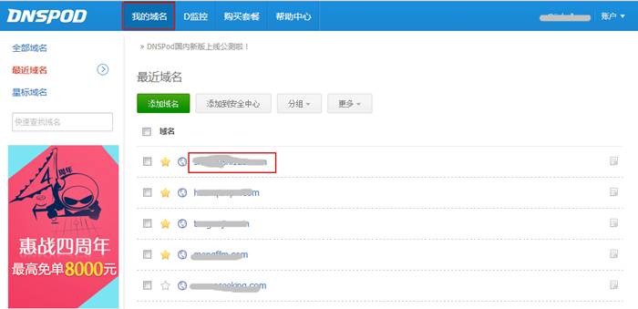 2.点击【我的域名】>>点击需要解析的域名,如图;